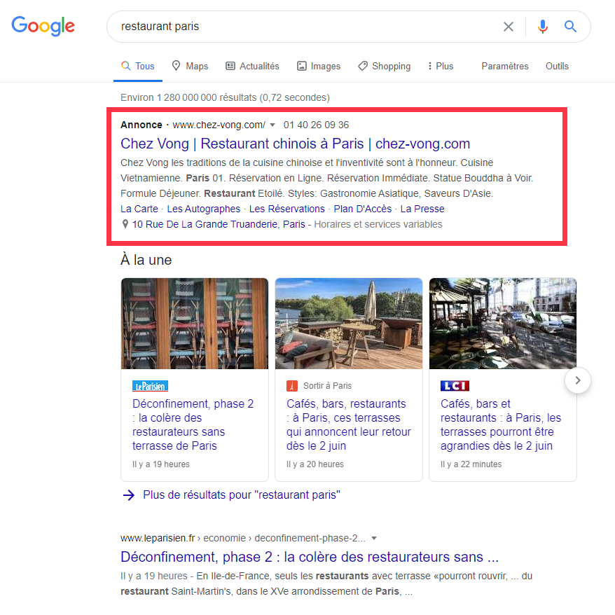 Ci-dessous vous trouverez une annonce publicitaire sur le moteur de recherche à la requête "restaurant Paris". En saisissant les mots clés les plus populaires, on peut avoir jusqu'à quatre annonces dans la section supérieure. Mais vous le savez déjà, si vous avez déjà effectué une recherche sur Google.