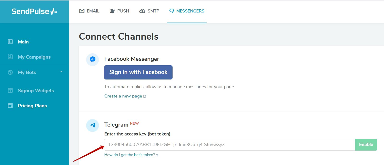 Copiez la valeur de votre token et ajoutez-la à votre compte SendPulse.