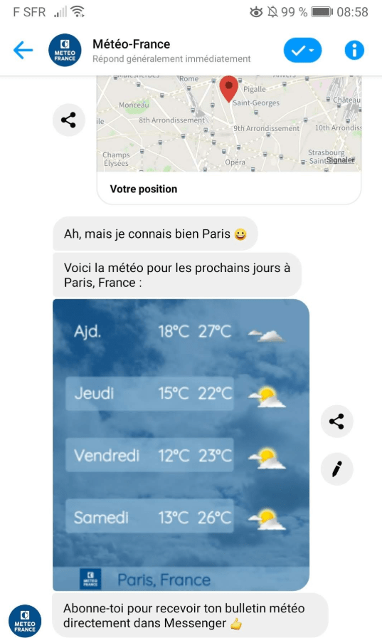 Enfin, le chatbot de Météo-France sur Facebook fournit les informations sur les conditions climatiques.