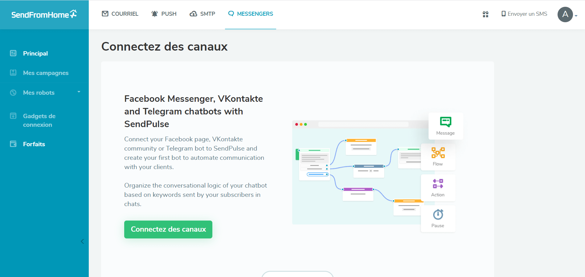 Il s'agit d'un service qui vous permet de créer et de gérer des chatbots connectés aux messagers et aux réseaux sociaux. Si cette technologie est nouvelle pour vous, choisissez une plate-forme de chatbot avec un plan gratuit, comme SendPulse, afin que vous puissiez apprendre comment les chatbots fonctionnent et les tester sans investir un dollar.