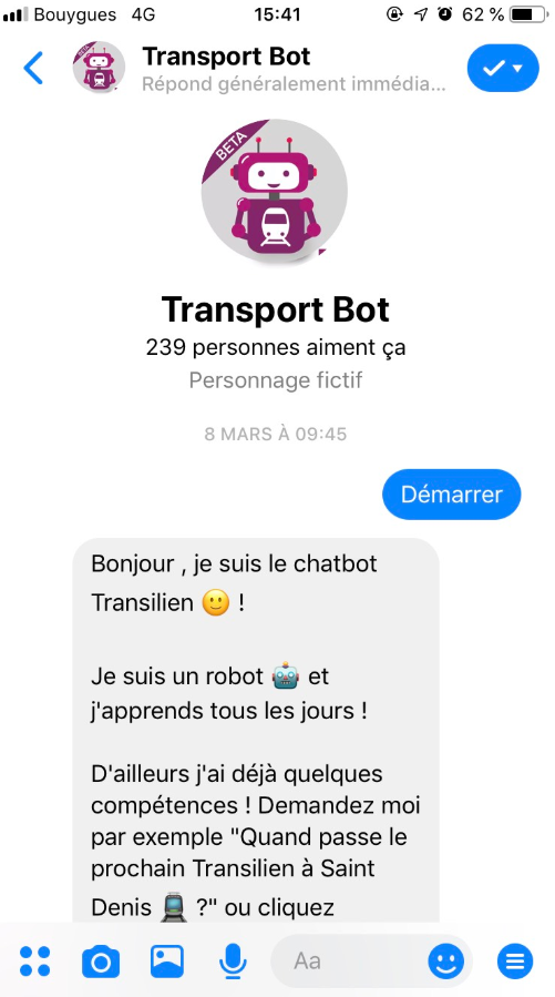 Voici comment le Transilien utilise un chatbot pour vous aider à vous préparer pour vos trajets. Ici, vous pouvez vous informer sur les itinéraires, le trafic etc.