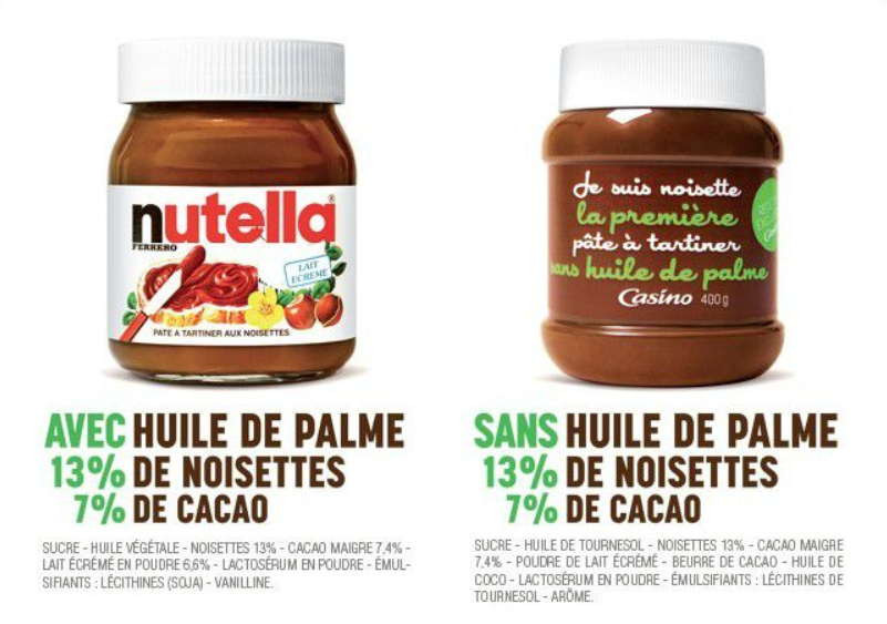 La pâte à tartiner de marque de distributeur Casino qui se comparait avec le Nutella en détaillant la composition des deux marques de pâtes à tartiner et en soulignant le fait que la pâte à tartiner de Casino n’utilisait pas d’huile de palme.