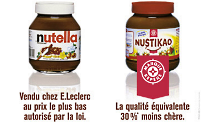 Publicité comparative entre Nustikao (pâte à tartiner des magasins E. Leclerc) avec la pâte à tartiner Nutella qui mettait en avant un prix 30 % moins élevé pour une qualité équivalente.
