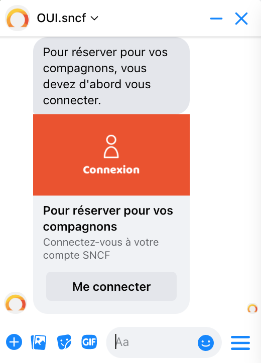 La SNCF a depuis longtemps fait le choix d’un chatbot, accessible depuis le site Ouisncf.fr ou bien directement via la messagerie de Facebook. Celui-ci permet de trouver un billet de train ou d’être directement informé de l’actualité liée à l’entreprise.