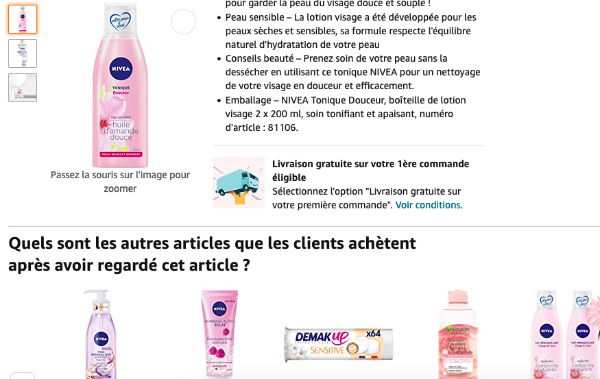 Ci-dessous, vous pouvez voir un exemple de Nivea. Si vous recherchez une lotion visage, vous pouvez remarquer des produits fréquemment achetés ensemble sous la fiche produit.