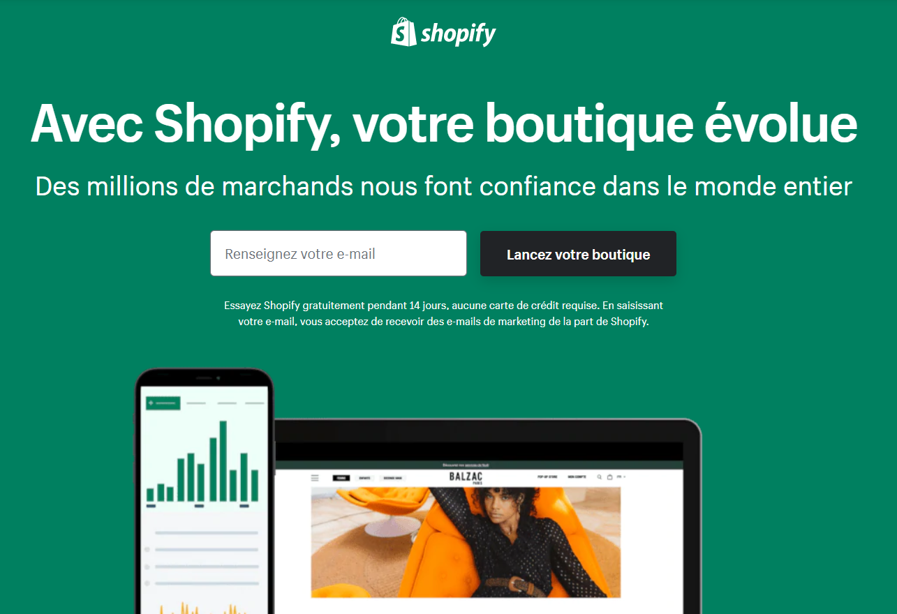 Par exemple, Shopify attire les utilisateurs avec un essai gratuit de 14 jours. Les gens peuvent utiliser le service pour différents types d’activités.