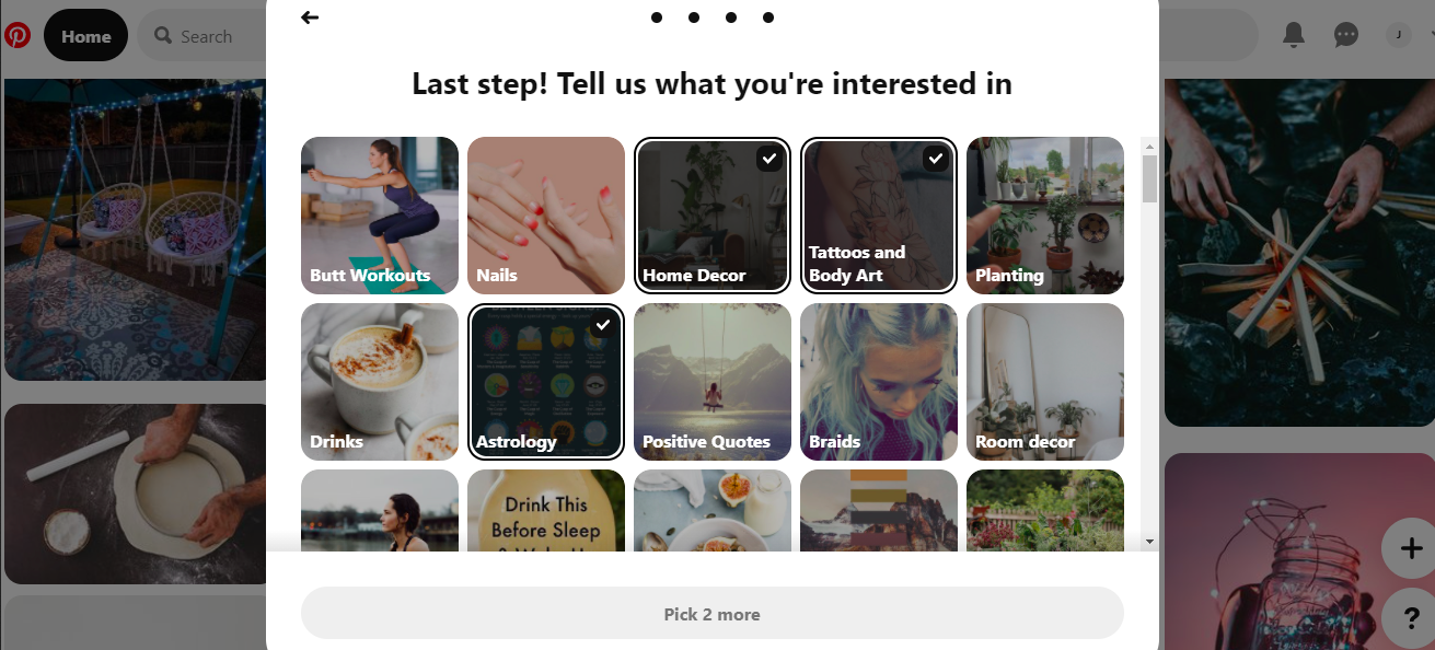 Le service de partage d’images est un bon exemple d’un processus d’onboarding. Après l’inscription, les utilisateurs sont invités à répondre à quelques questions concernant leurs centres d’intérêt. Le service fonctionne en fonction des catégories que les utilisateurs apprécient le plus. En conséquence, Pinterest fournit aux utilisateurs tout ce dont ils ont besoin.