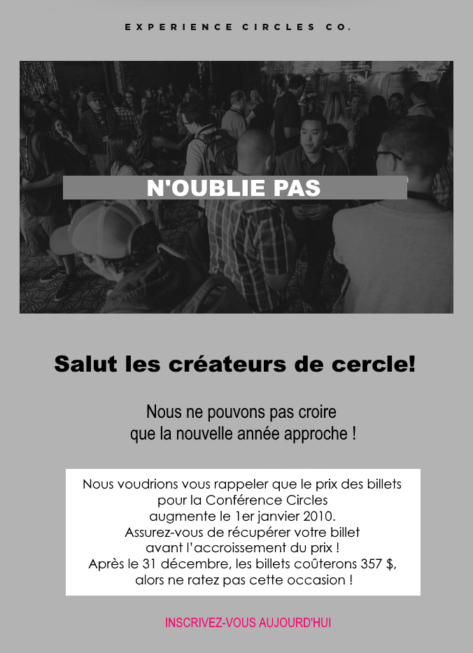 Cela créera un sentiment d'urgence et vous aidera à attirer plus de participants dès le début. Les inscrits qui profitent de la réduction sont plus susceptibles de partager les nouvelles de votre événement avec leurs amis. Consultez l'extrait de cet e-mail d'invitation à l'événement de Circle qui encourage les abonnés à acheter des billets dès que possible.