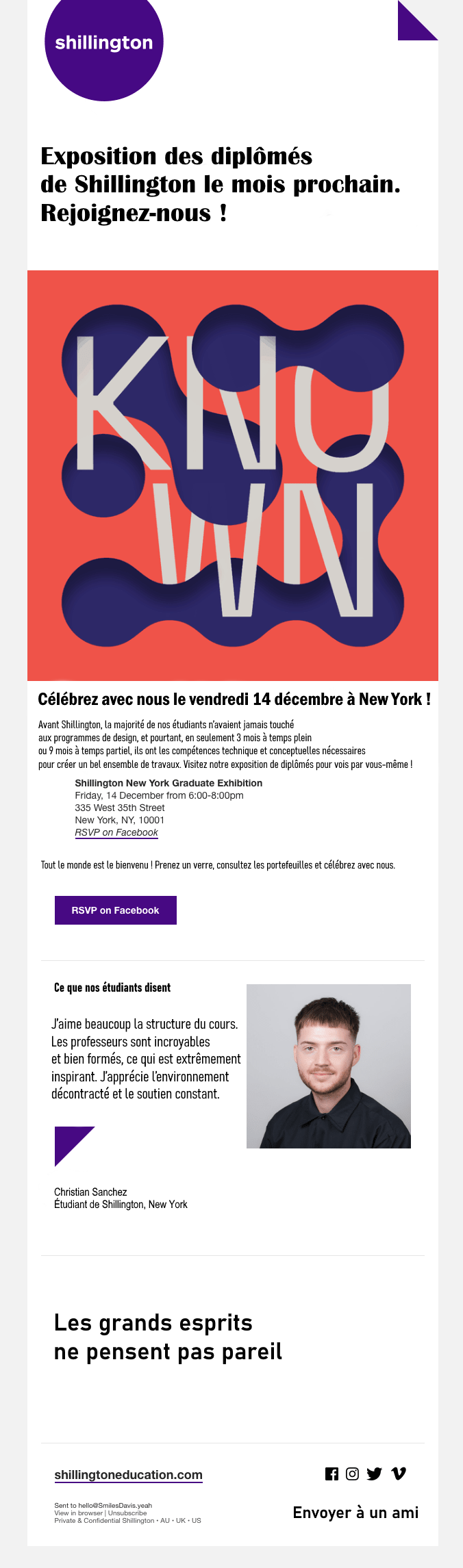 C’est une invitation à une exposition des étudiants diplômés de Shillington. Grâce à la grande image, nous comprenons que le spectacle est lié au design. Les commentaires d’autres étudiants montrent que l’événement est de grande qualité et que les enseignants sont des professionnels passionnés. Puisque l'événement s'adresse aux futurs étudiants et jeunes gens, cette section de commentaire est juste au point.