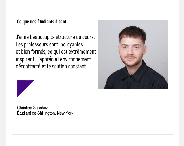 La preuve sociale fonctionne toujours, surtout lorsque les commentaires proviennent d'une personne à laquelle votre public cible s'associe. Dans l'exemple ci-dessous, le public cible est composé d'étudiants et de jeunes gens, donc les commentaires d'une personne de leur âge fonctionnent parfaitement.