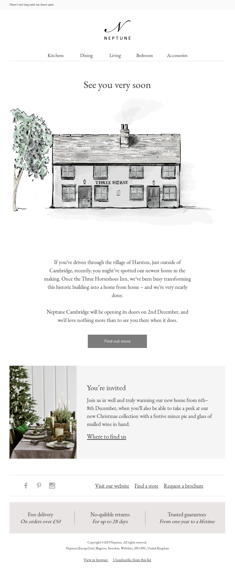 Ceci est un email d'invitation à un événement de Neptune. C’est un exemple impressionnant du secteur de l’immobilier, qui nous montre comment faire un événement intéressant de quelque chose de terne. Il semble que cet email soit ciblé par géolocalisation, ce qui est difficile à réaliser techniquement. Une belle image montre une maison confortable, encourageant les gens à visiter cet endroit une fois la reconstruction terminée. Imaginez, avec un morceau de tarte dans une main, un verre de vin chaud dans une autre, quelqu'un décidera d'acheter cette maison le soir du Nouvel An.