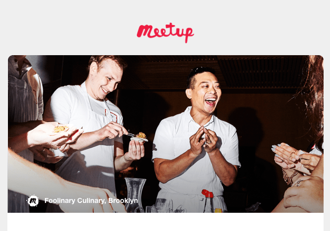 Les destinataires verront ce qu'ils pourraient manquer s'ils n'assistent pas à votre événement. Appliquez cette technique pour provoquer une réponse émotionnelle en utilisant la peur de manquer. Cet extrait d'un email d'invitation Meetup prouve que les gens s'amusent lors de leurs événements.