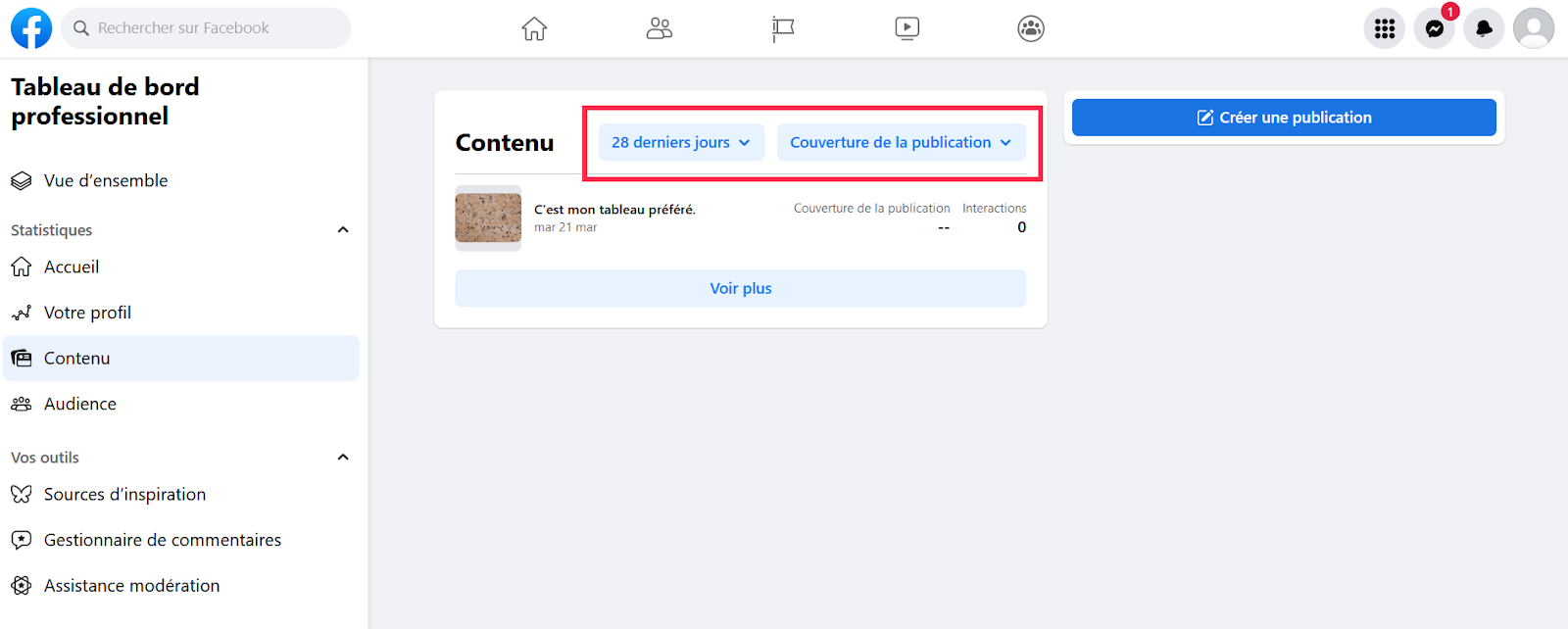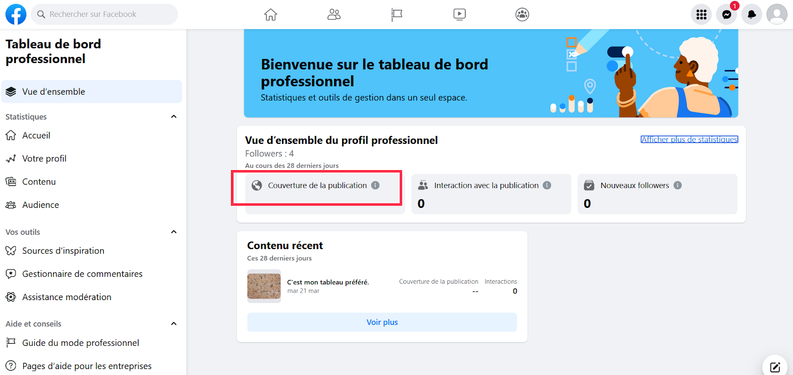 Dans votre Tableau de bord professionnel, vous pouvez voir le nombre de personnes atteintes par l’une de vos publications dans l'onglet « Vue d’ensemble ».