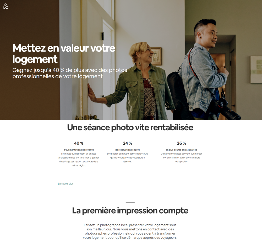 Cependant, il ne suffit pas de tirer du trafic du site Web de votre concurrent. Airbnb savait qu'il lui fallait une proposition de valeur unique, c'est pourquoi il en a proposé une. Les photos des annonces sur les sites Web concurrents étaient terribles. Les gens ne pouvaient pas voir ce qu'ils payaient et refusaient de réserver quoi que ce soit. Les propriétaires d'Airbnb ont loué un appareil photo et ont pris des photos de haute qualité du plus grand nombre d'appartements possible. Un mois après le début du test, les revenus ont doublé. Depuis, Airbnb propose des services photo professionnels aux hôtes.