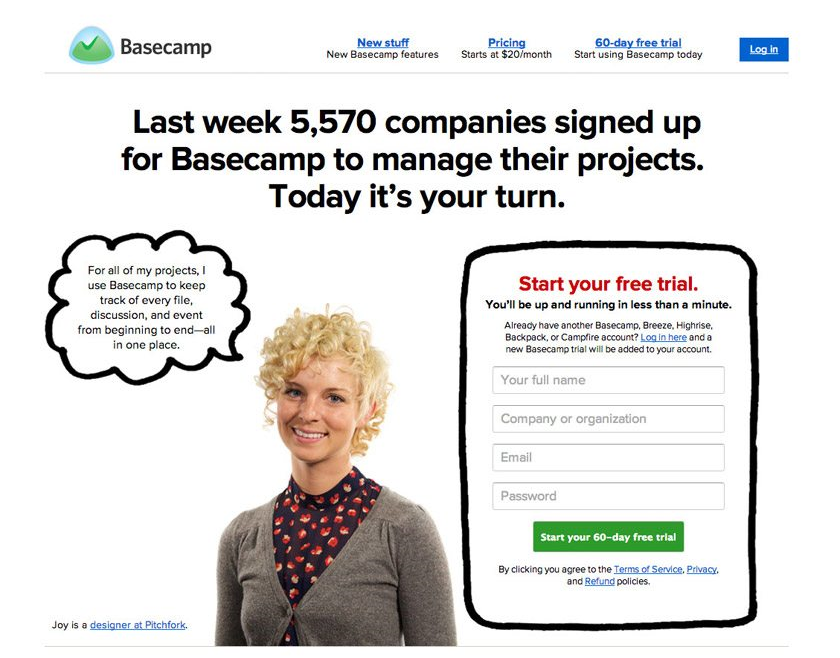 Et maintenant, Basecamp. Un essai de 60 jours est un excellent truc marketing pour attirer l'attention :