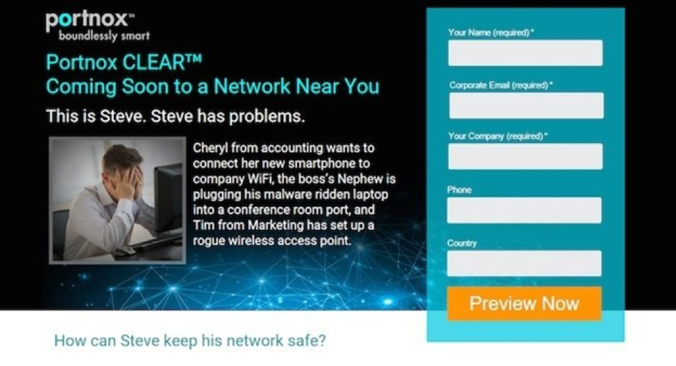 Voici une page de destination de Portnox. Une page à conversion élevée tire parti d'excellentes images et d’un formulaire :
