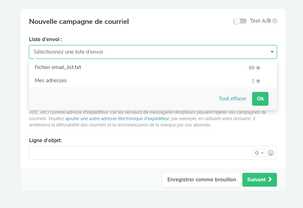 Choisissez l’adresse email de l’expéditeur, son nom et définir l’objet de l’email.