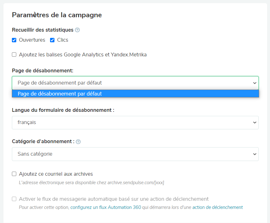 Choisissez les options de collecte des statistiques. N’oubliez pas de définir le lien de désabonnement.