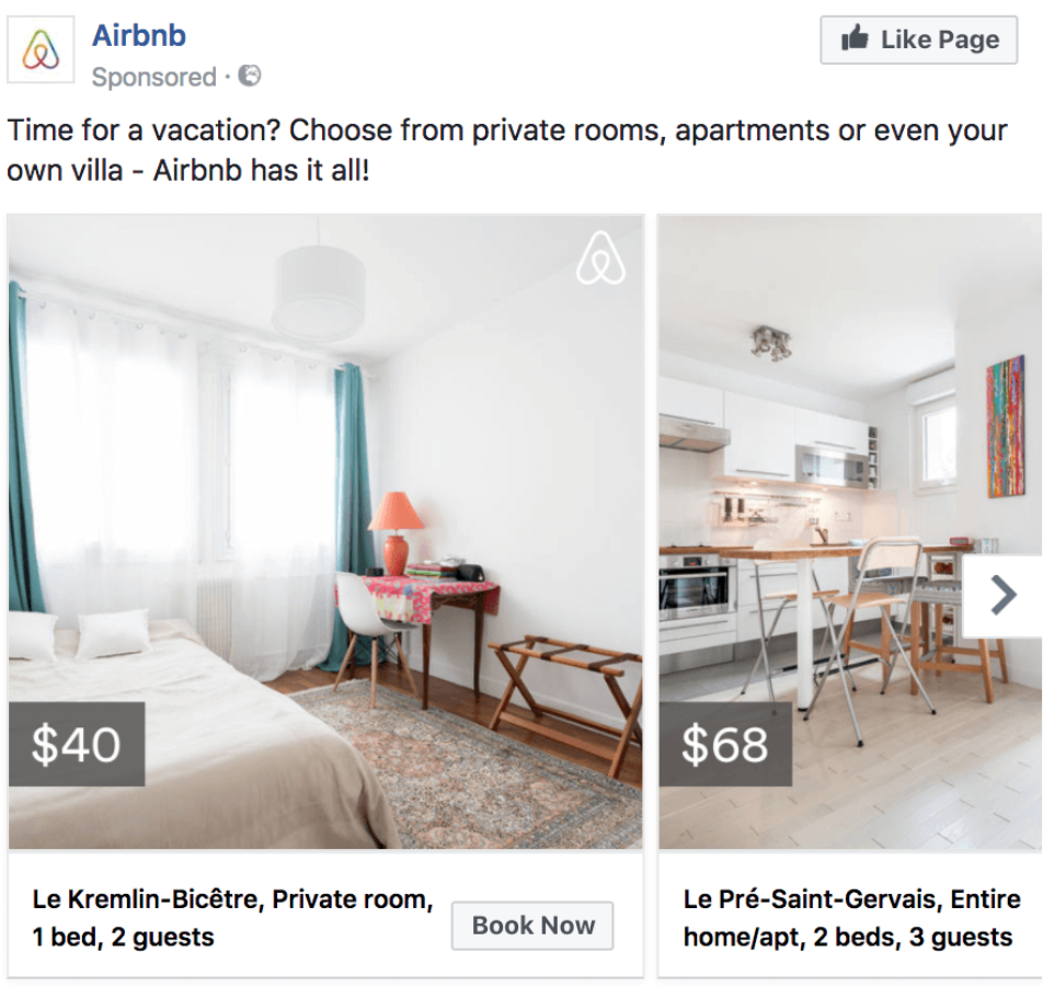 Encore un exemple de remarketing sur les réseaux sociaux, avec Airnb qui propose des fiches produits pour une destination.