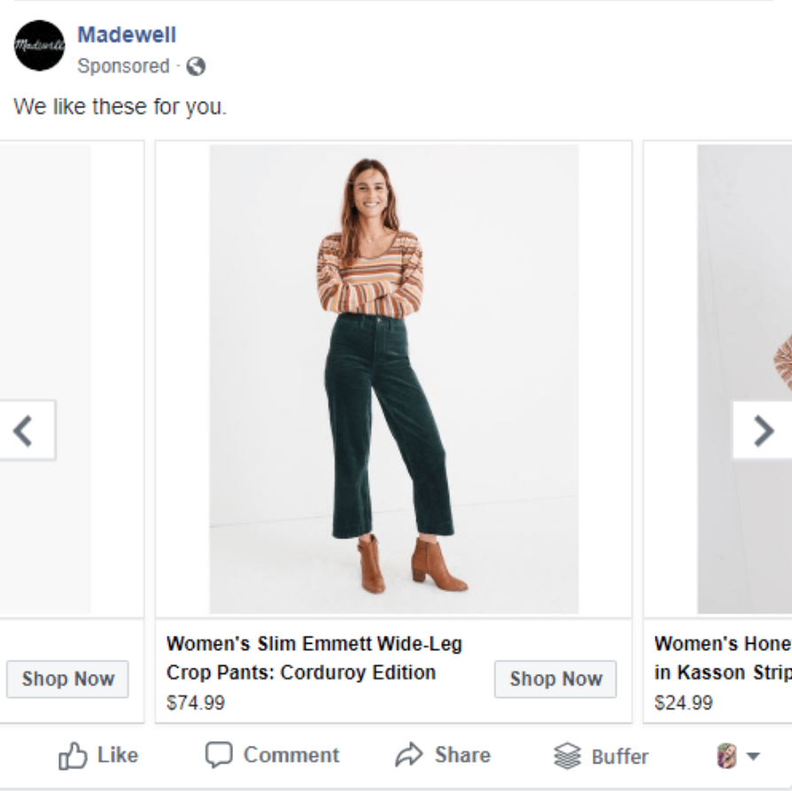 Ici, Madewell diffuse des fiches produits directement sur le réseau social Facebook.