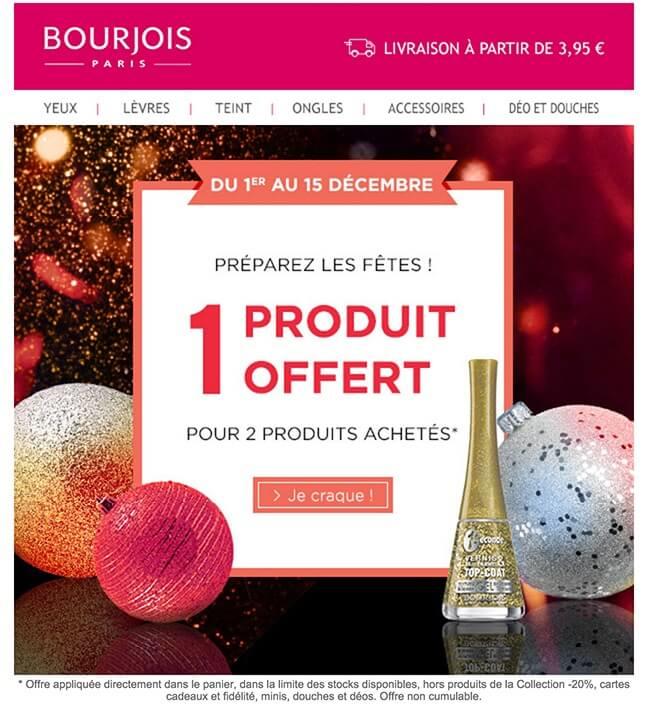 L’email est également une plateforme efficace pour offrir des cadeaux publicitaires. Vous pouvez créer une campagne de cadeaux sur des ressources spécialisées telles que Rafflecopter et maintenir l’engagement des utilisateurs avec les emails de cadeaux. L'exemple ci-dessous montre comment Bourjois encourage les gens à acheter 2 produits, en promettant de leur donner encore 1 produit gratuitement.