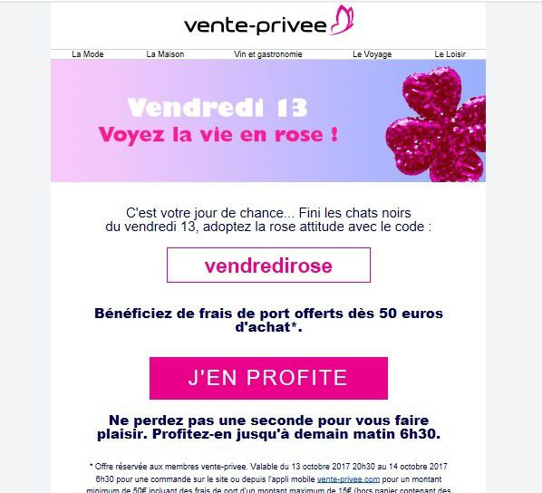C'est l'un des canaux de marketing numérique les plus efficaces, avec un retour sur investissement dépassant 4100 %. Les spécialistes du marketing utilisent la promotion des ventes pour la maturation de prospects, la réactivation, etc. Pour réussir, les spécialistes du marketing combinent les ventes avec des matériels éducatifs. Dans cet email promotionnel, Veepee offre aux clients la possibilité d’avoir des frais de port gratuits.