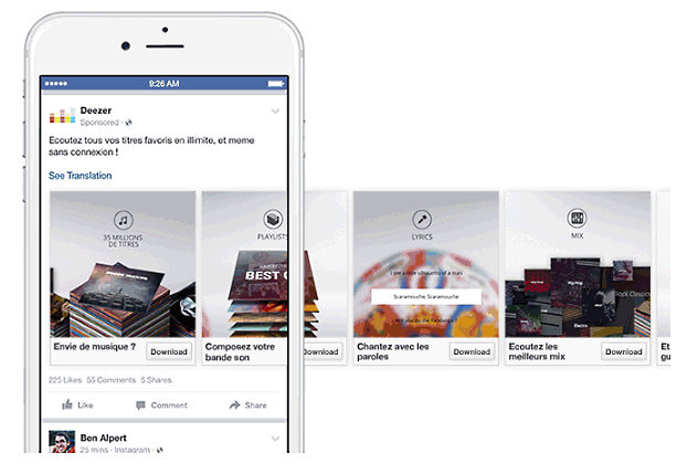 Facebook est l'une des plateformes publicitaires les plus puissantes en raison de sa couverture mondiale et de ses options de ciblage détaillées. La publicité Facebook permet d'utiliser différents types d'annonces pour répondre à toutes les demandes et à tous les budgets. Voici un exemple d'annonce carrousel par Deezer.