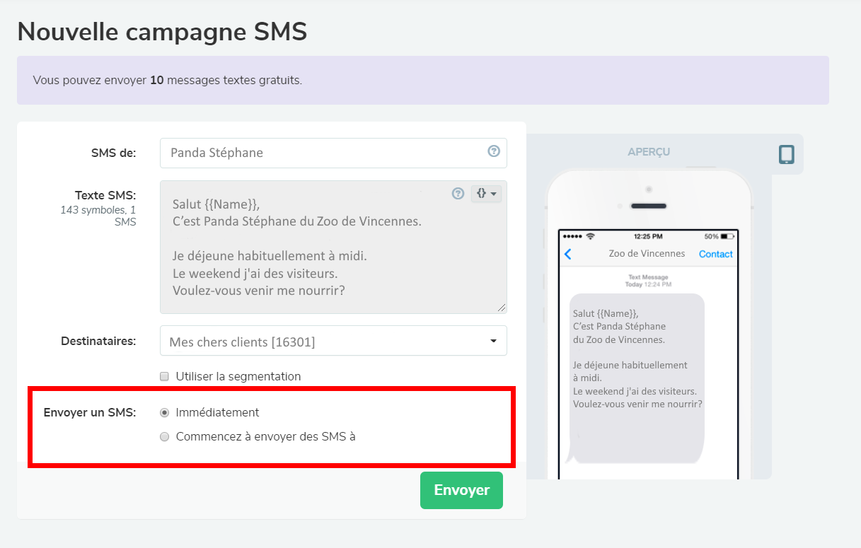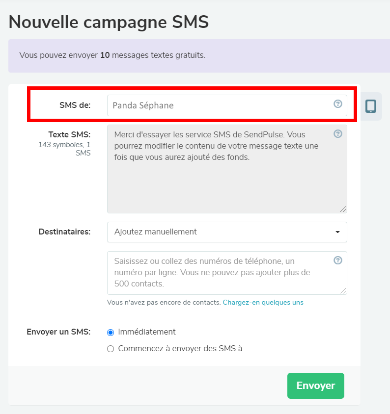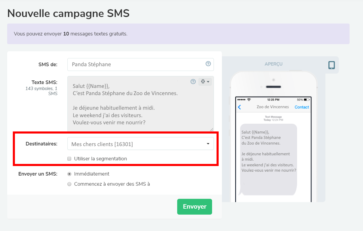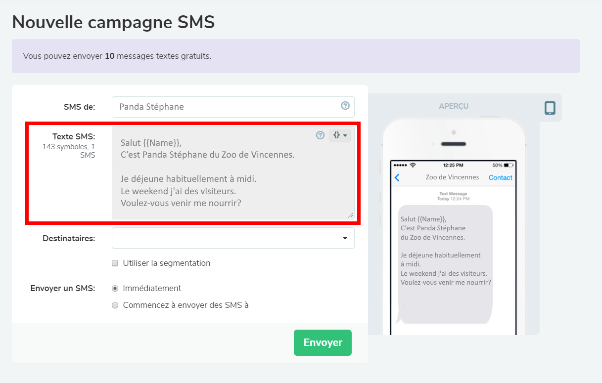 La longueur d'un SMS est de 160 symboles. Vous pouvez personnaliser un message à l'aide de variables. Différents abonnés recevront des SMS légèrement différents, basés sur des données personnelles comme le nom, le sexe, le pays, etc. Vous pouvez voir à quoi ressemblera votre publicité SMS sur un téléphone mobile, en la prévisualisant sur le côté droit.