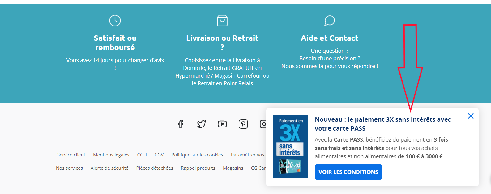 Le supermarché Carrefour affiche une petite notification push dans le coin inférieur de l'écran. Cette notification informe sur les possibilités de voir les conditions d'utilisation de la carte PASS.