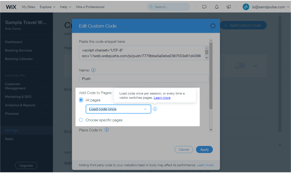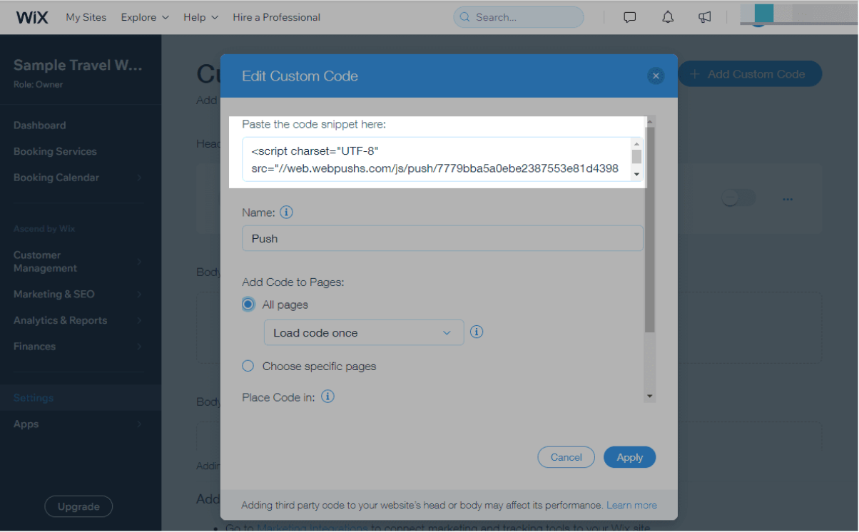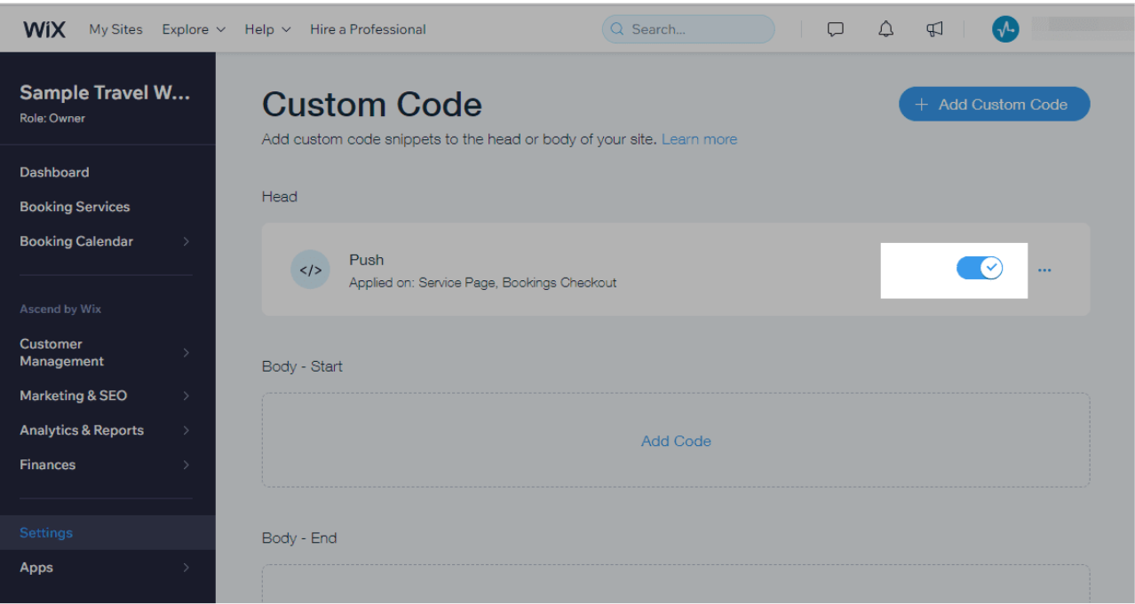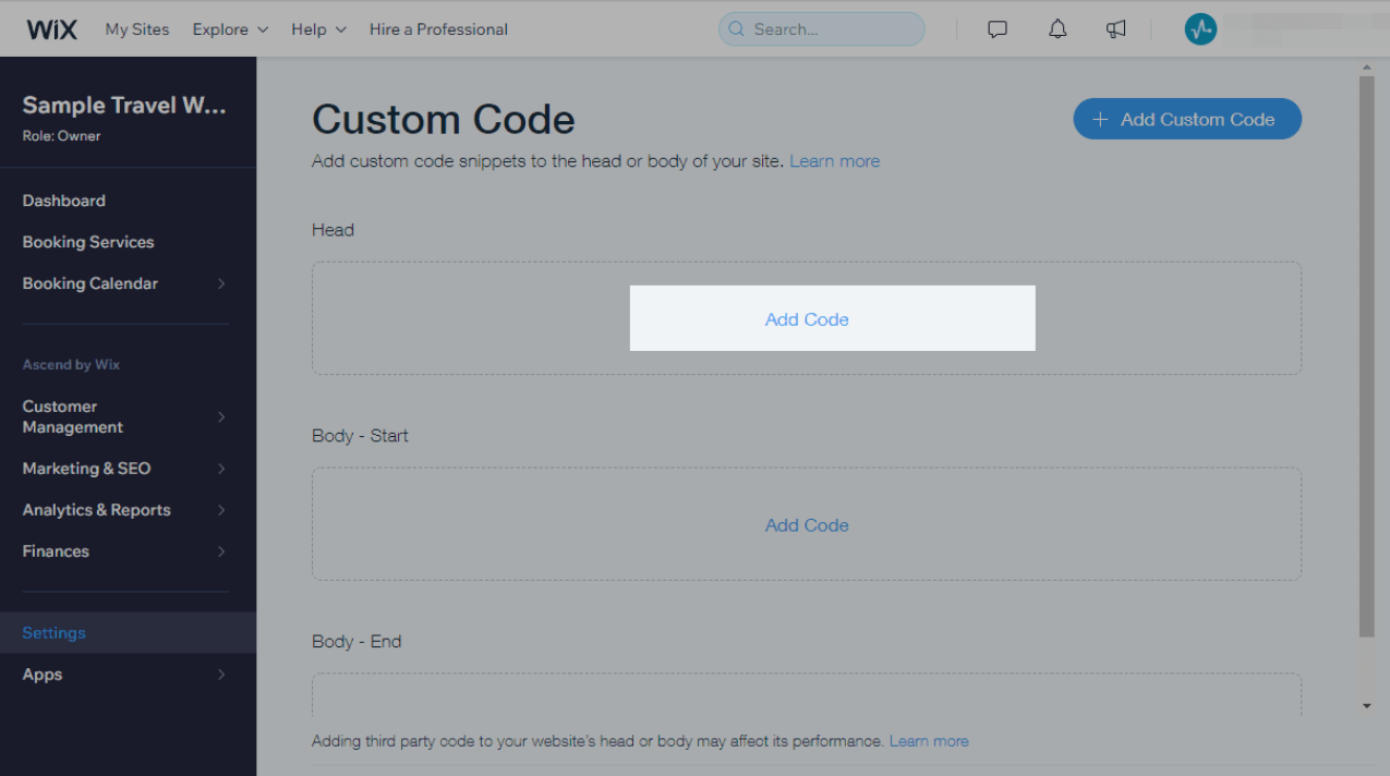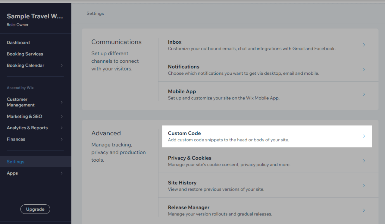 Depuis la plateforme de votre constructeur, ici Wix, sélectionnez votre site, allez dans l'onglet « Paramètres », faites défiler jusqu'aux paramètres avancés et cliquez sur « Code personnalisé ».