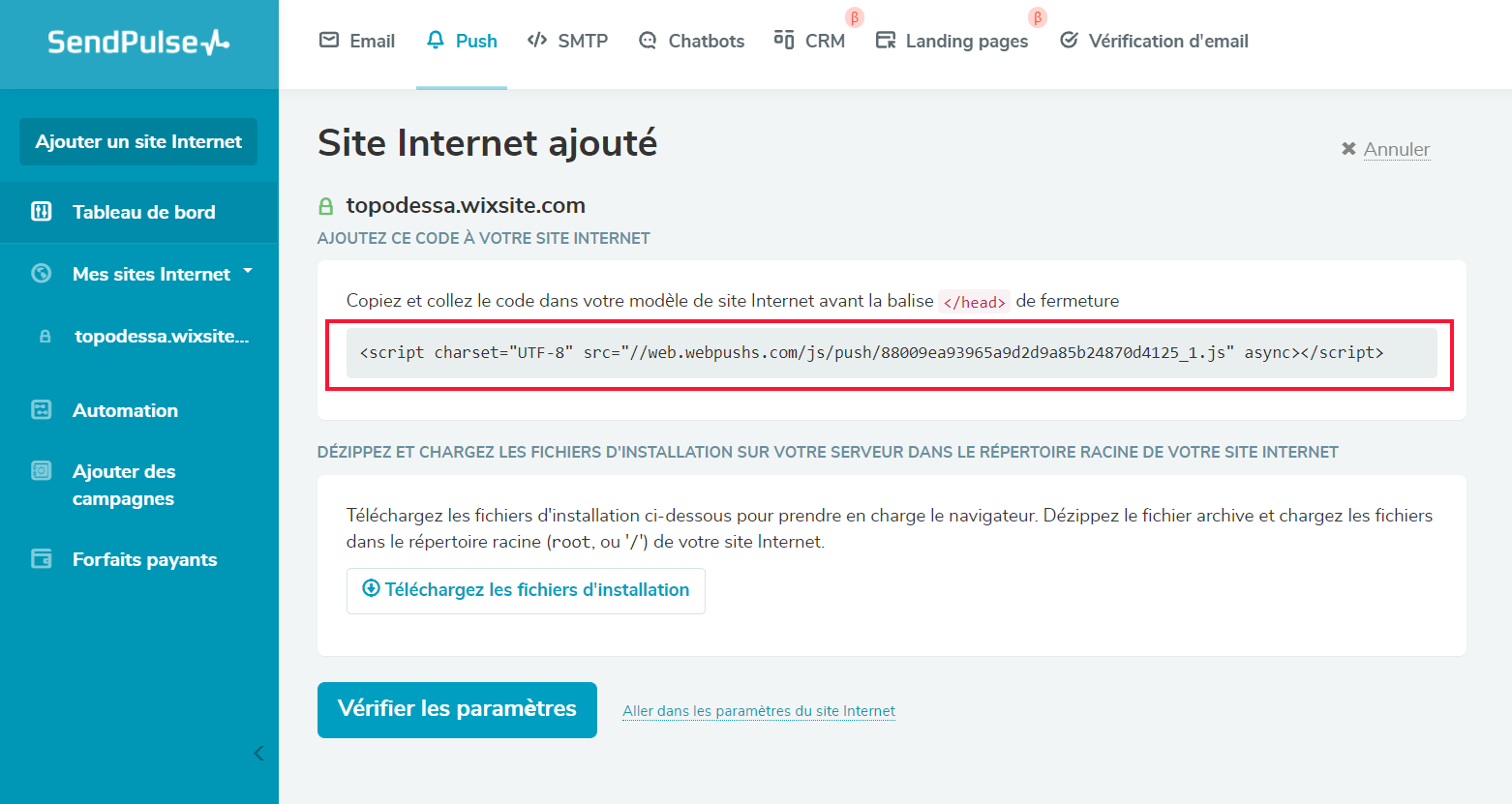 Avant de commencer vous devez ajouter votre site sur la plateforme SendPulse, puis aller dans l’onglet « Push » et copiez le script.